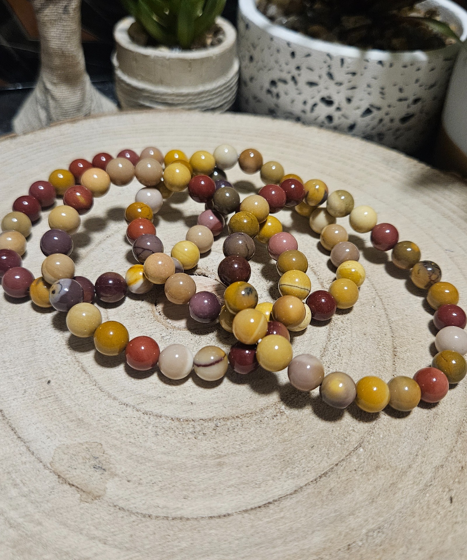 Jaspis Mookait v sebe nesie starovekú energiu austrálskej púšte a svojimi žiarivými farbami – od sýtej červenej a bordovej až po odtiene slnečnej žltej a krémovej – ponúka svojmu nositeľovi jedinečný zážitok. Tento elastický náramok vyrobený z 8mm korálok nie je len šperkom, ale aj silným nástrojom na uzemnenie a stabilizáciu.