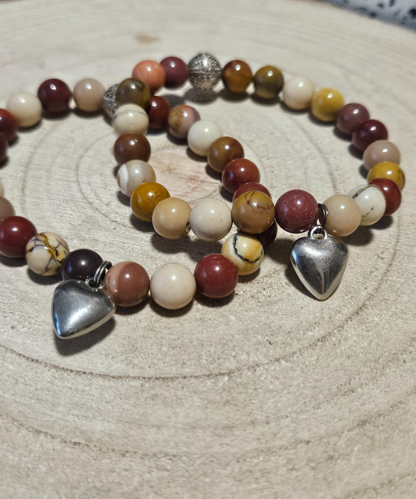 Tento náramok z korálok jaspisu Mookait je symbolom cesty a vnútornej transformácie. Mookait je považovaný za liečivý kameň Zeme, ktorý svojou uzemňujúcou a stabilizujúcou energiou podporuje v obdobiach zmien. Jeho živé, zemité farby – sýtočervená, bordová, žltá a krémová – vyžarujú harmóniu a rovnováhu. Náramok zdobí jemné kovové srdiečko, ktoré posilňuje pocit lásky, nežnosti a otvorenosti. 8 mm korálky sú navlečené na elastickej šnúrke, čo zaisťuje pohodlné nosenie.