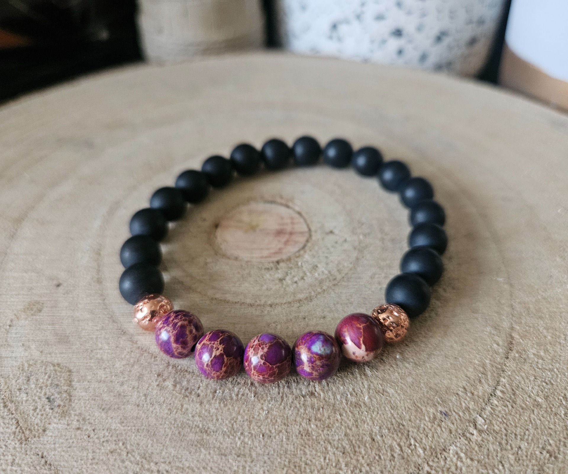 Tento náramok z korálok jaspisu regalite a farbenej lávy vytvára dokonalú rovnováhu medzi kreatívnou energiou a uzemňujúcou silou. Jedinečný purpurovo-ružový a biely vzor jaspisu regalite evokuje predstavivosť a harmóniu, zatiaľ čo matné čierne lávové korálky poskytujú stabilný základ. Štýlové kovové korálky vo farbe ružového zlata slúžia ako elegantný doplnok. 8 mm korálky sú navlečené na elastickej šnúrke, čo zaisťuje pohodlné a flexibilné nosenie.