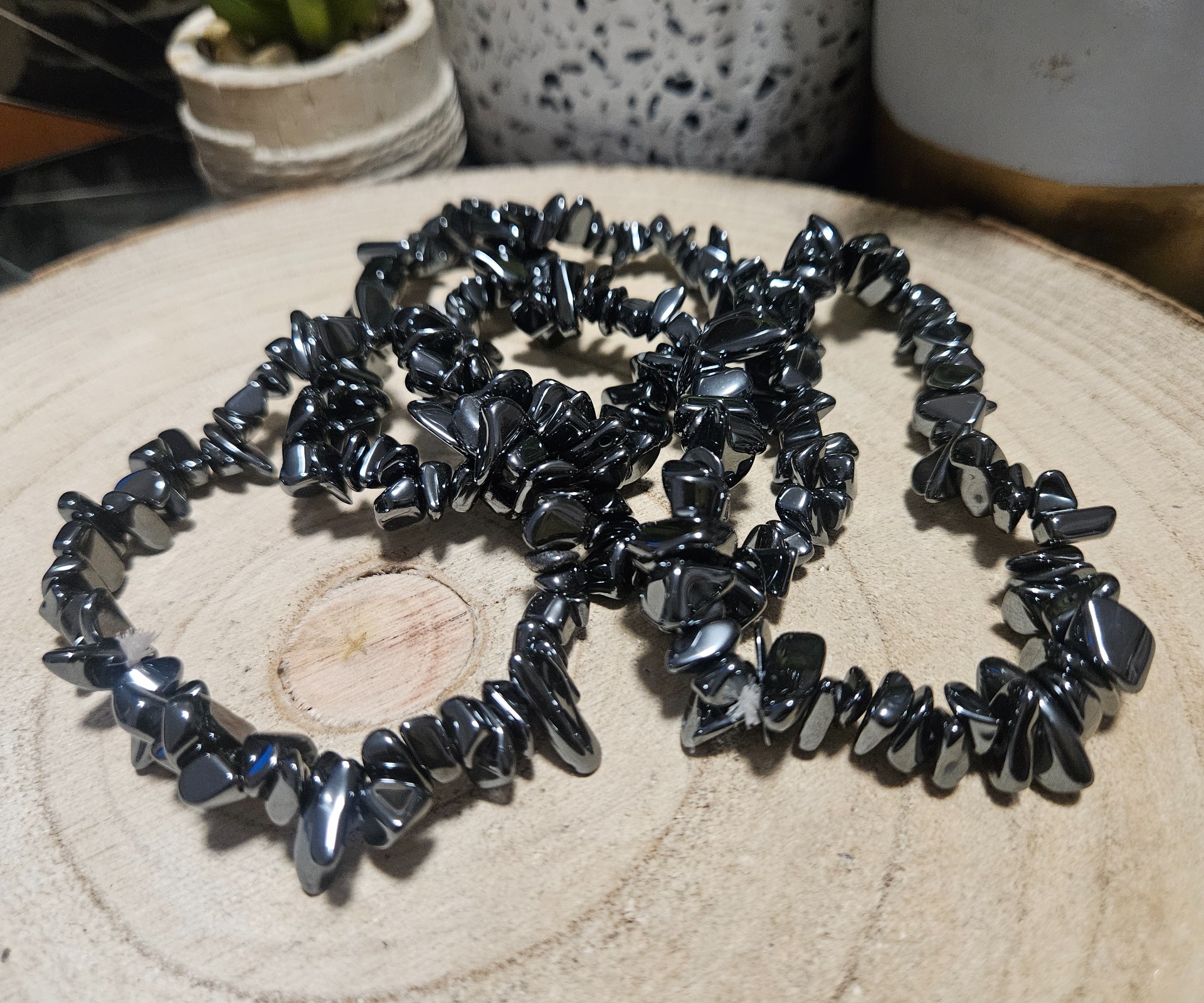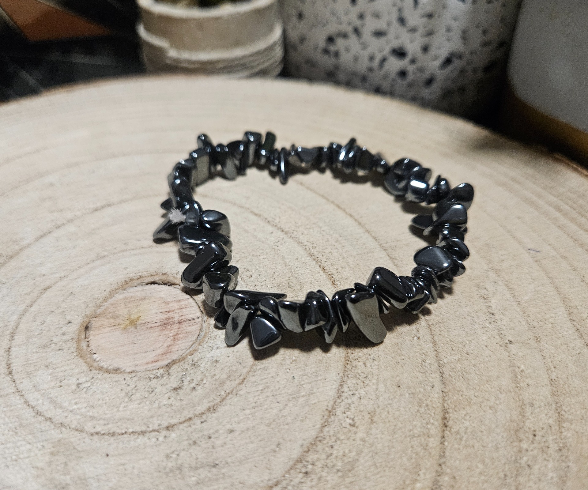 Tento Hematitový Chip Náramok ponúka jedinečný a moderný prístup ku klasickému ochrannému minerálu. Náramok nie je zložený z pravidelných guľôčok, ale z malých, leštených, nepravidelne tvarovaných kúskov Hematitu (chipov/úlomkov)]. Kovový, oceľovo-šedý povrch každého úlomku sa leskne, čo dodáva náramku dynamický a textúrovaný vzhľad.
