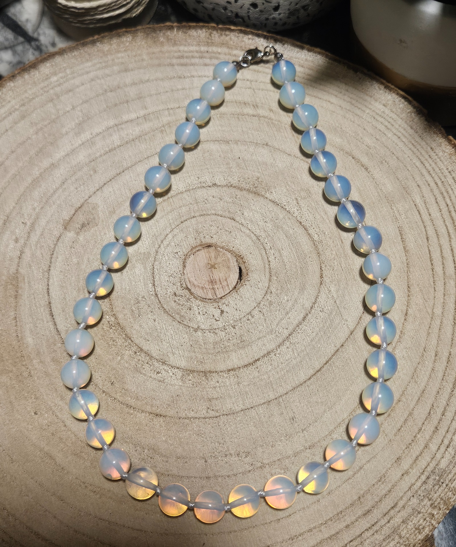 Popis: Klasický 45 cm dlhý náhrdelník, ktorý tvoria starostlivo leštené Opalitové korálky s priemerom 10 mm. Náhrdelník jemne spočíva na dekolte a vizuálne zvýrazňuje tajomnú žiaru Opalitu. Vďaka svojmu umiestneniu v blízkosti Hrdelnej čakry a Čakry tretieho oka podporuje komunikáciu a intuíciu.