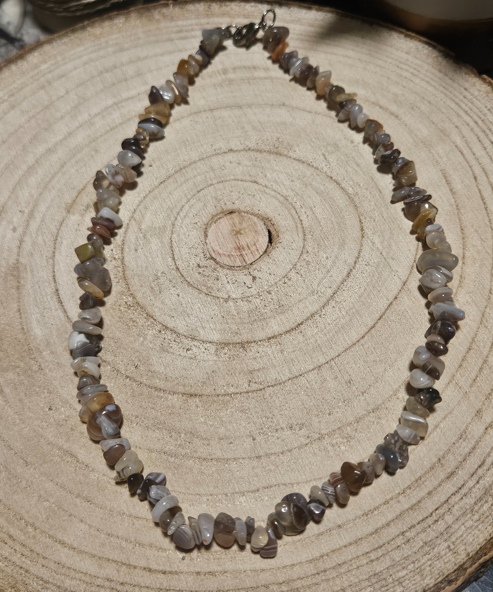 Botswanský achát je unikátny vzorovaný achát v odtieňochhnedej, krémovej a ružovej, ktorý prináša pokoj, vnútornú stabilitu a odvahu.Pomáha spracovávať napätie, zvyšuje kreativitu a podporuje prijatie zmien.Hovorí sa tiež, že má priaznivé účinky na fyzické zdravie, ako je dýchanie,pokožka a trávenie, a môže pomôcť prekonať závislosti.