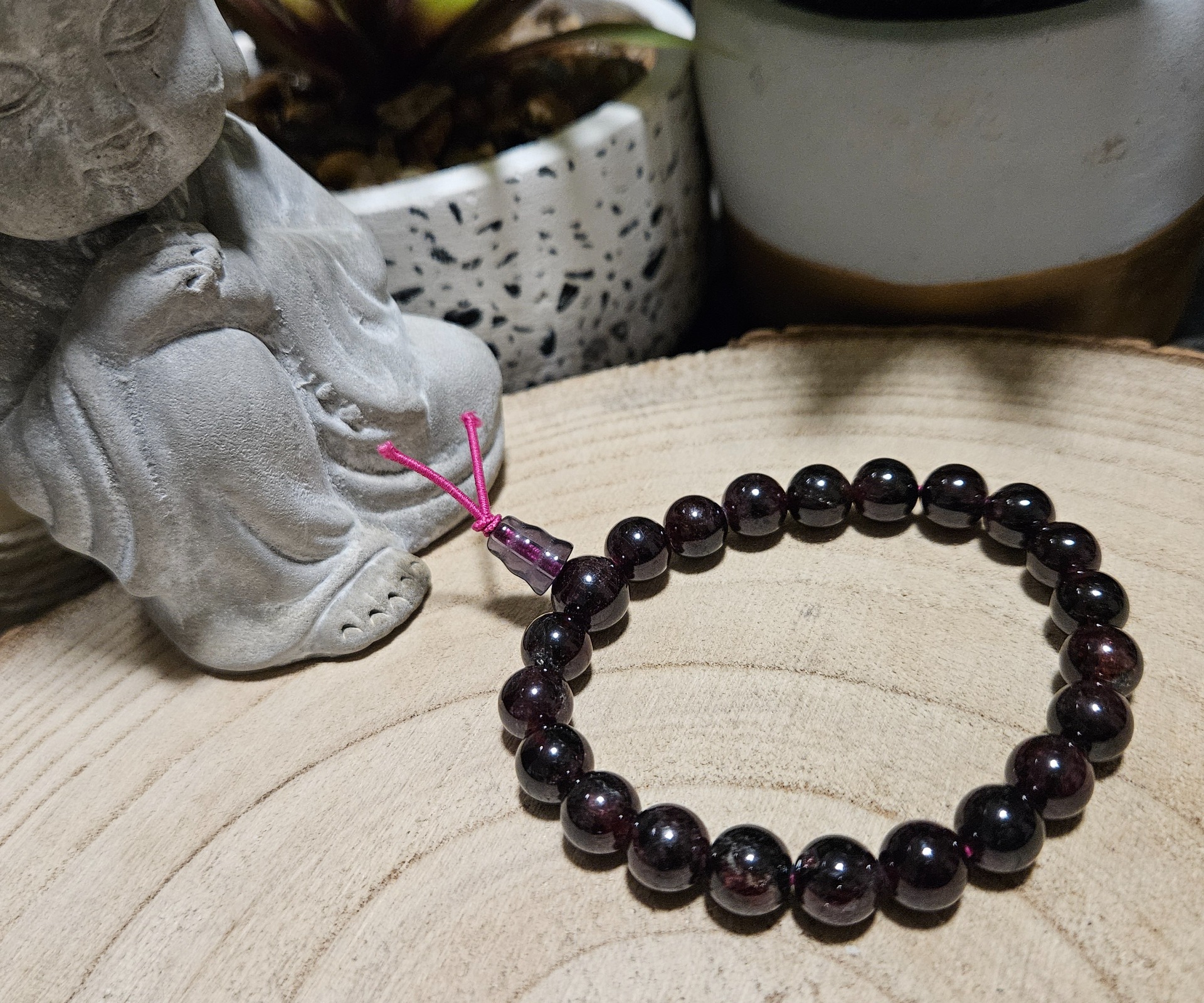 Tento výnimočný náramok v sebe spája silu zeme a hlboký vnútorný pokoj. Dominujú mu sýte, tmavočervené korálky gránátu s priemerom 8 mm, ktoré dopĺňa výrazná 10 mm „guru“ korálka, symbolizujúca múdrosť a duchovné vedenie. Celý šperk je navlečený na pevnej, pružnej gumičke, ktorá je zakončená drobným uzlíkom evokujúcim pokojnú silu Budhu. Pri každom dotyku s pokožkou vám gránát pripomenie vašu vlastnú stabilitu, zatiaľ čo guru korálka vám pomôže udržať si jasnú myseľ aj v náročných dňoch. Je to viac než len ozdoba – je to osobný talizman, ktorý vás uzemní a dodá vám odvahu kráčať vlastnou cestou s ľahkosťou a úsmevom.