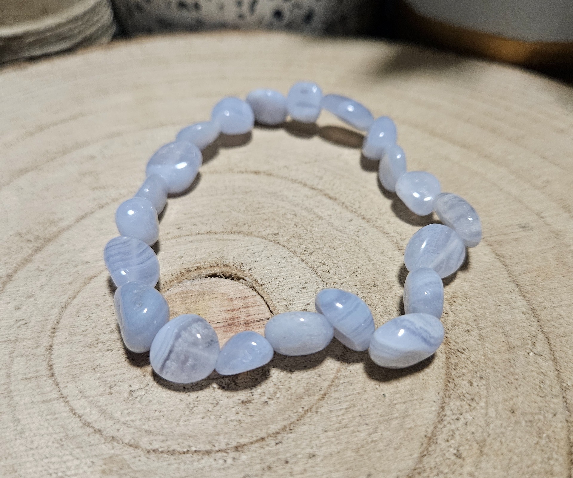 Ak stres z každodenného života blokuje váš hlas, tento náramok je tu, aby pomohol. Tento krásny, jemný, étericky modrý Náramok Modrý Chalcedón Nugget nie je len módny doplnok: je to talizman pokoj a čistej komunikácie na vašom zápästí.