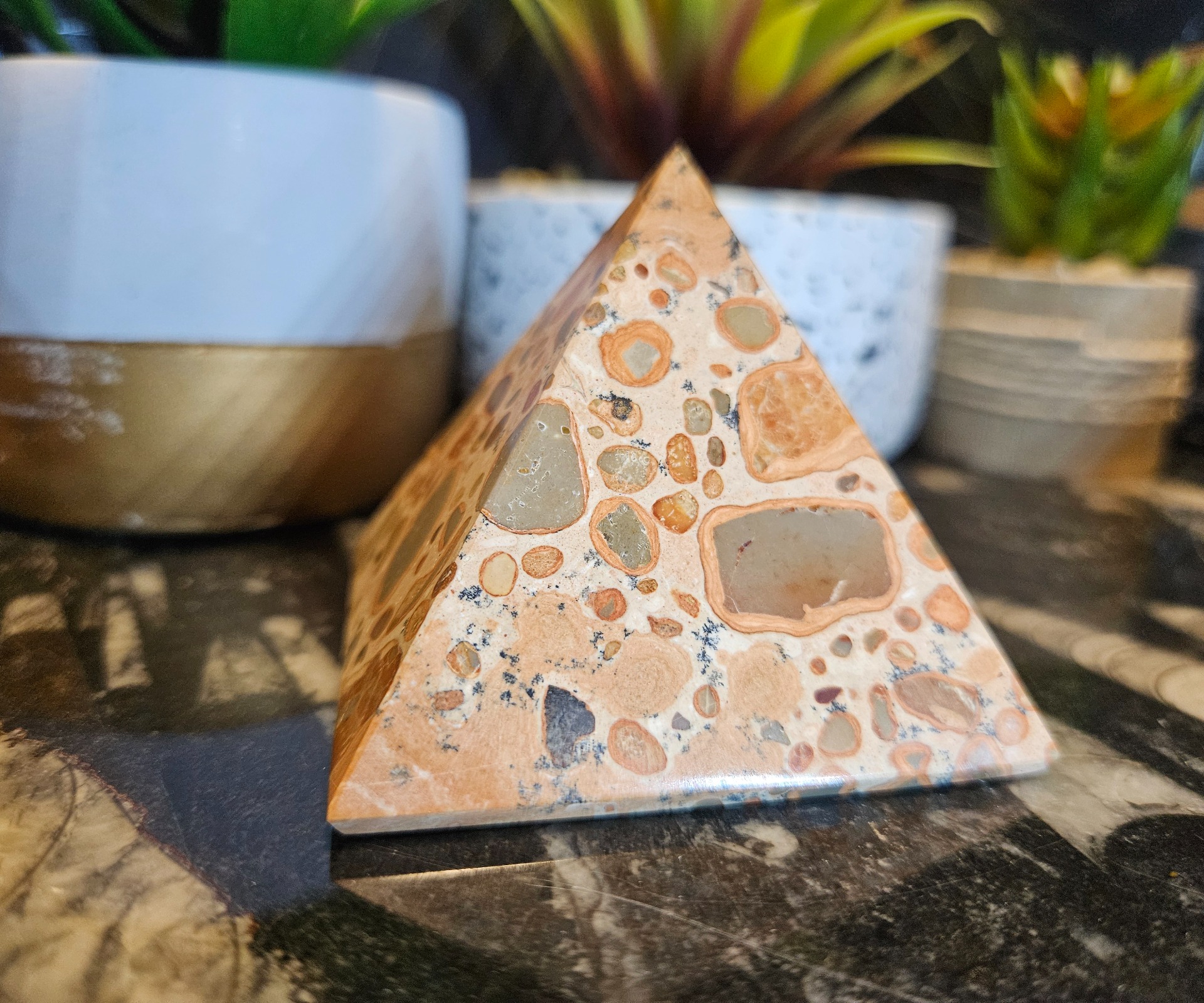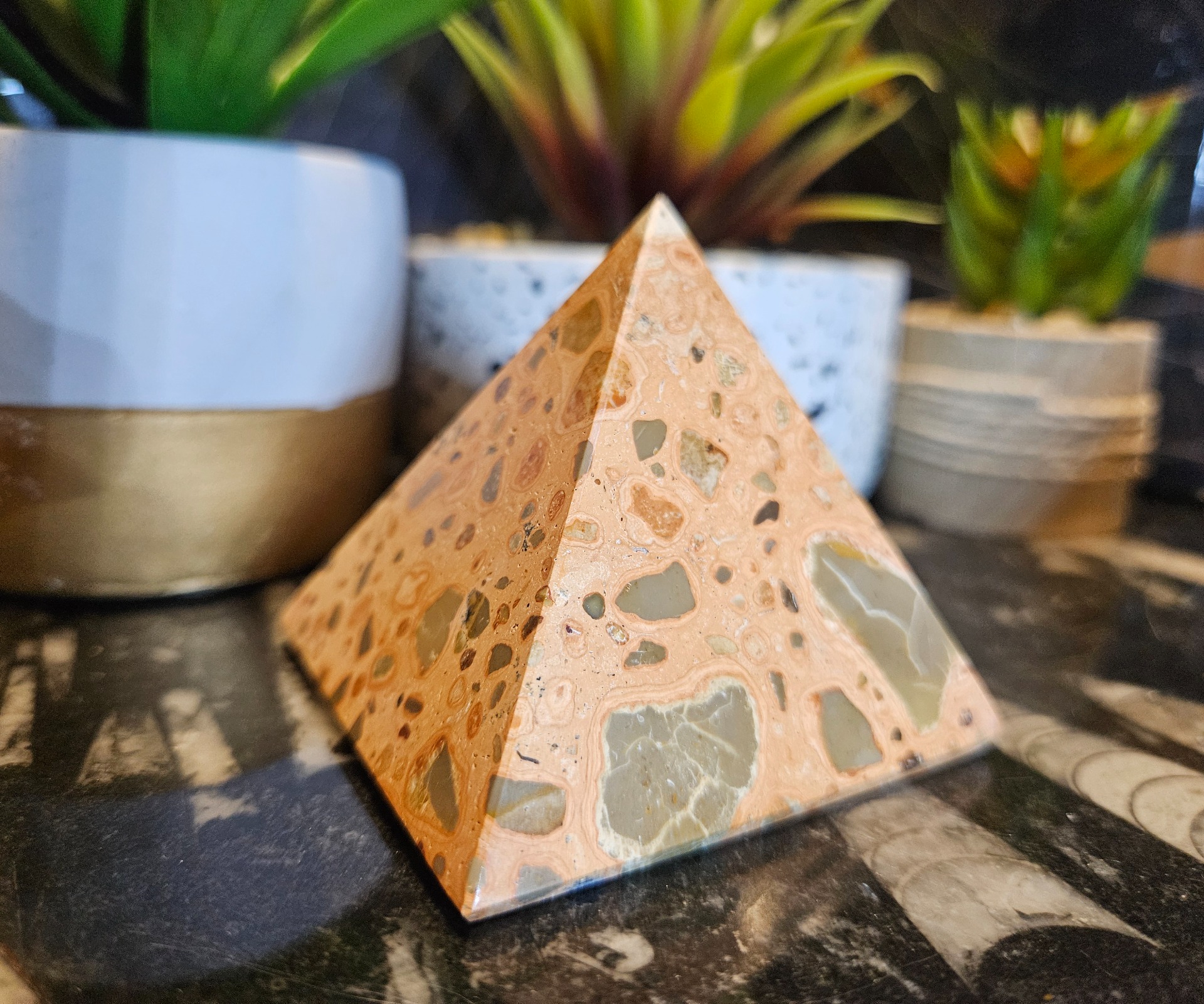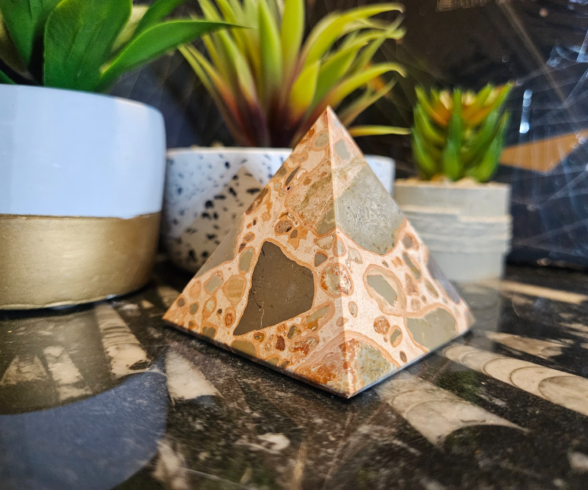 Táto krásna, 6×6 cm pyramída z leoparditu dostala svoje meno podľa jedinečného škvrnitého vzoru, ktorý symbolizuje silu divočiny a hlboké spojenie s prírodou. Tvar pyramídy nie je len estetický, ale je aj silným nástrojom na zber a zameranie energie. Keďže je každý kúsok vyrobený z prírodného kameňa, farby a vzory sa môžu líšiť a výber je náhodný, čo zaručuje, že získate jedinečný originál.