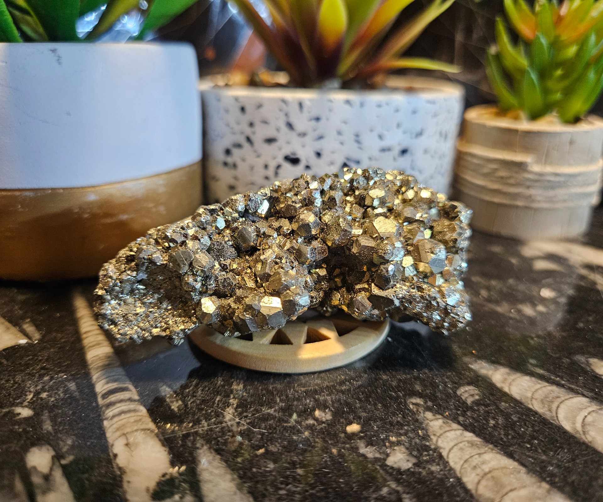 Kus železného pyritu položený na stôl dodá energiu všetkému okolo seba. Pomáha pri plánovaní veľkých podnikateľských zámerov. Svojho majiteľa kameň učí, ako nazerať na vonkajšiu fasádu a súčasne ho vedie k diplomatickému jednaniu.