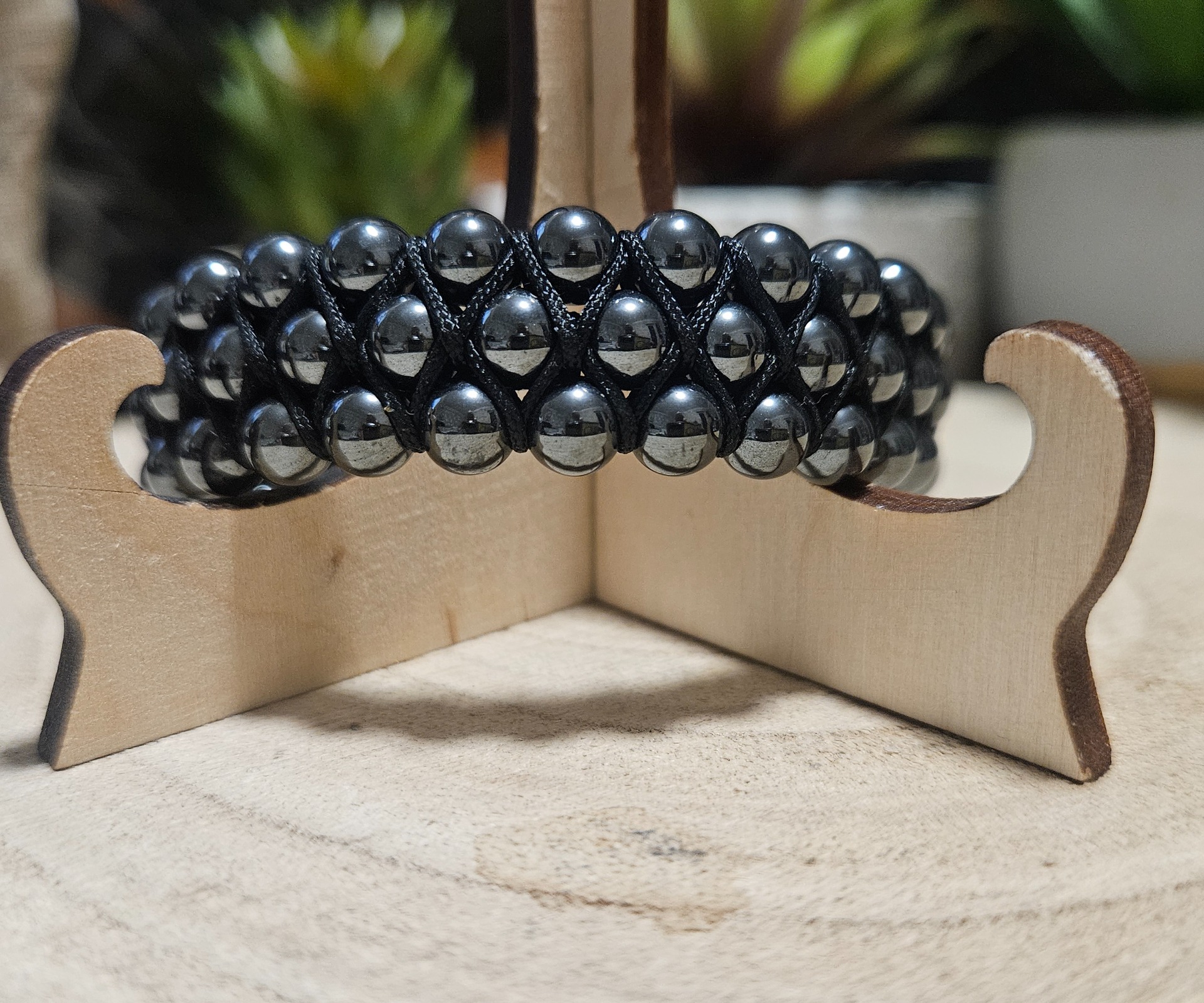 Zvýraznený Šamballa Štýl:Jedinečnou charakteristikou náramku je jeho navliekanie na Šamballa štýl uzlíkovanej šnúrky. Táto technika umožňuje, aby bol náramok nastaviteľný vo veľkosti a zaisťuje pohodlné a stabilné uchytenie na zápästí. Šamballa je symbolom pokoja a vyrovnanosti, ktoré sú spárované so stabilizujúcou silou Hematitu. Pletený vzor okolo centrálnej korálky, ako aj Hematitové korálky na koncoch uzáveru, dotvárajú Šamballa dizajn.