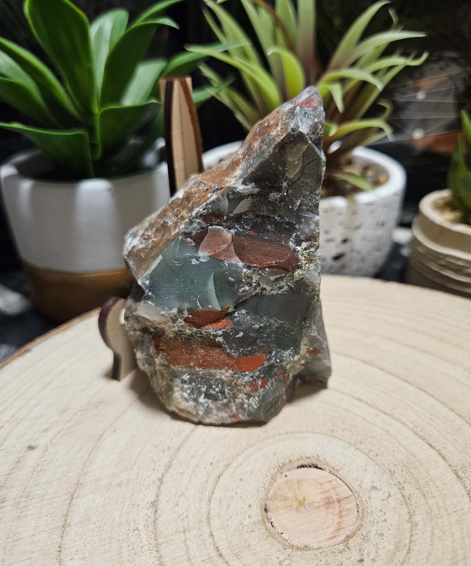 Tento 250 g, 8,5×6,5 cm surový kameň heliotropu prináša do vášho domova nedotknutú silu prírody. Heliotrop, známy aj ako krvavý kameň, je krásny a mystický vďaka svojej tmavozelenej farbe a charakteristickým červeným škvrnám. Jeho surová forma vám umožní priamo cítiť hlbokú, uzemňujúcu energiu kameňa.