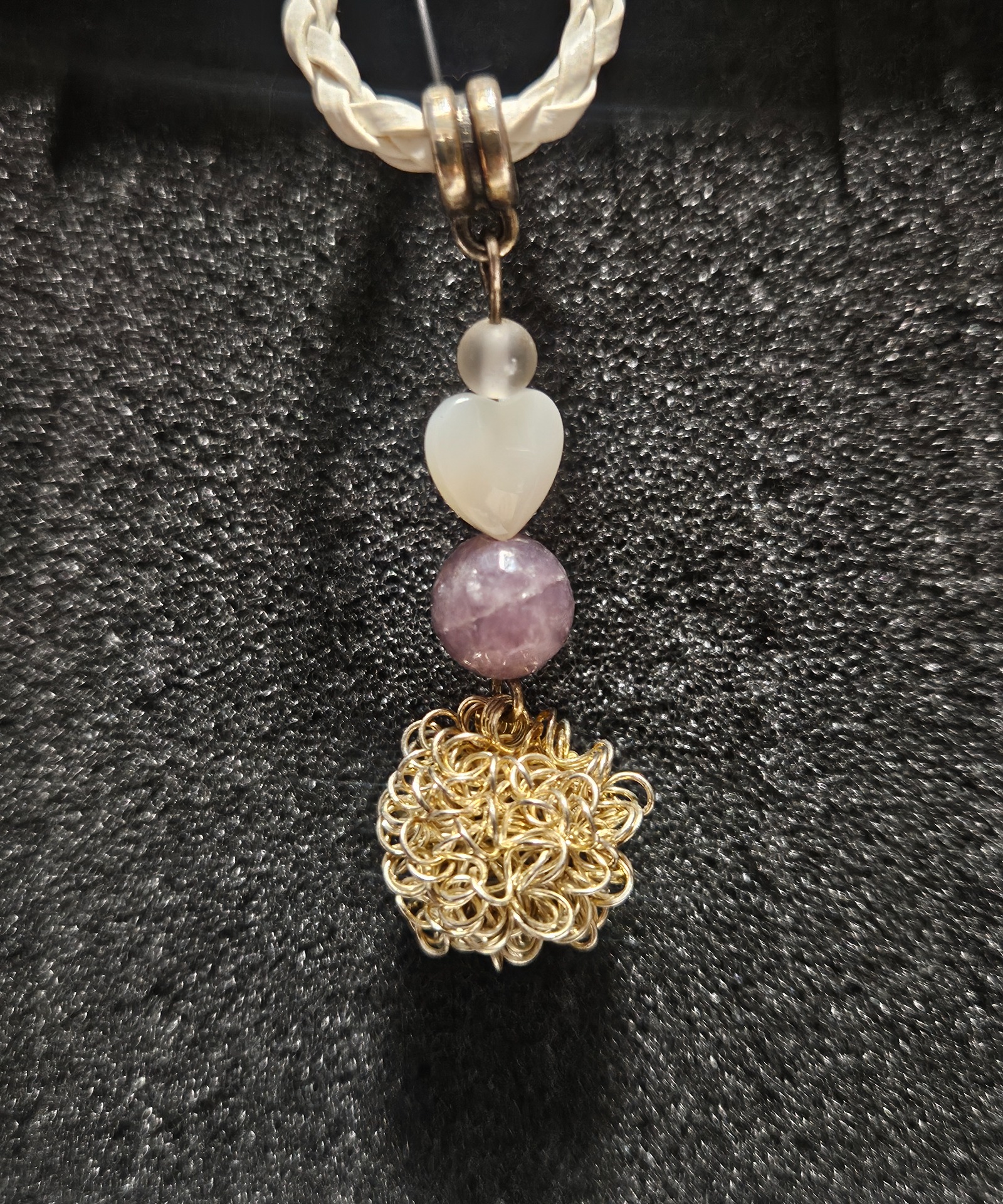 Ručne vyrobený prívesok (handmade). Obsahuje leštenú korálku Lepidolitu, biele Perleťové srdce a zlato sfarbený kovový dekoratívny prvok. Dodávané so zodpovedajúcim, pleteným, nastaviteľným bielym koženým náhrdelníkom.