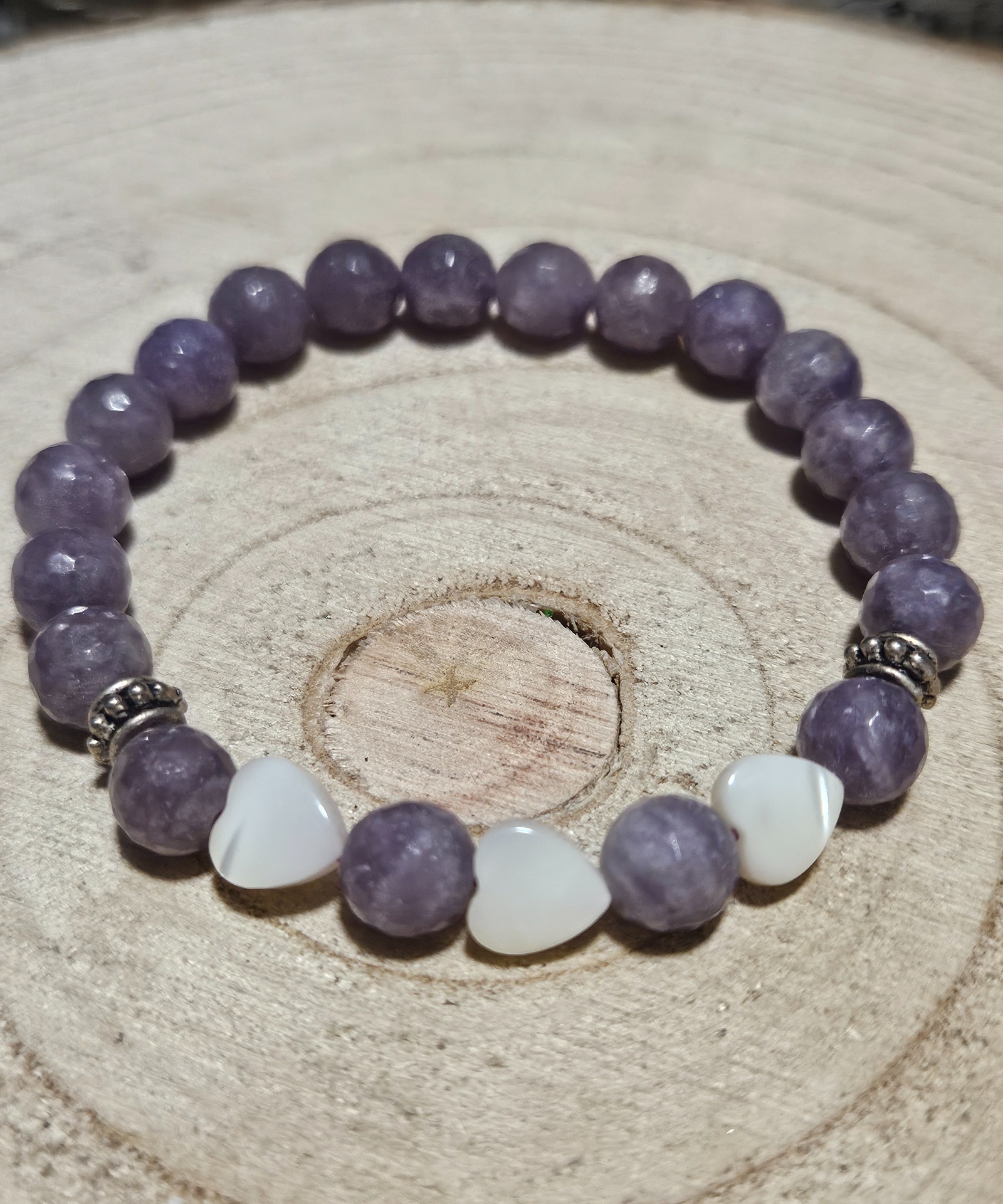 - Rozmer a Prevedenie: Vyrobené z 8 mm leštených Lepidolitových korálok, zdobené dvoma ozdobnými kovovými dištančnými korálkami a jemnými, srdcovitými, bielymi Perleťovými vložkami. Navlečené na pružnej gumičke pre pohodlné nosenie.