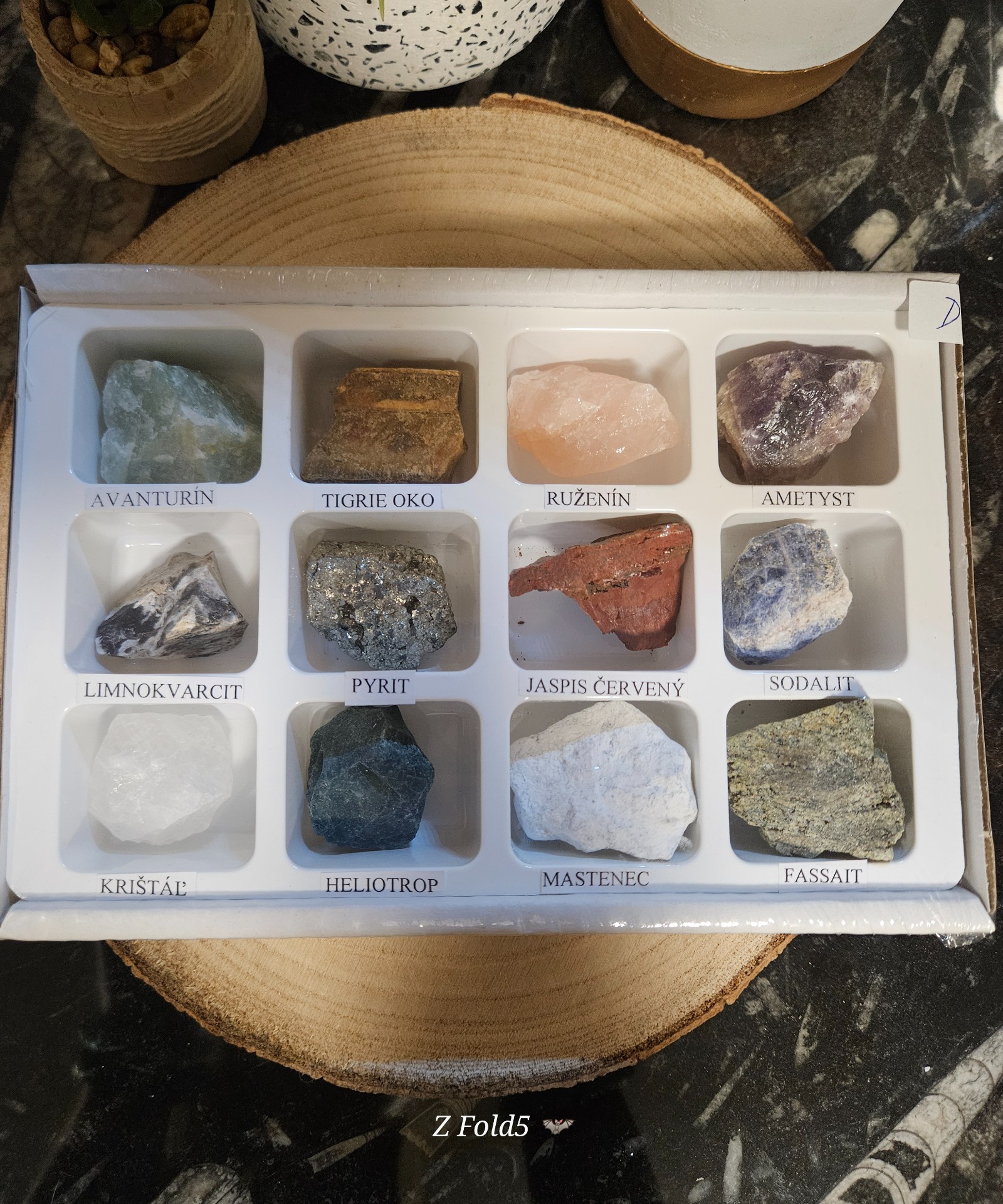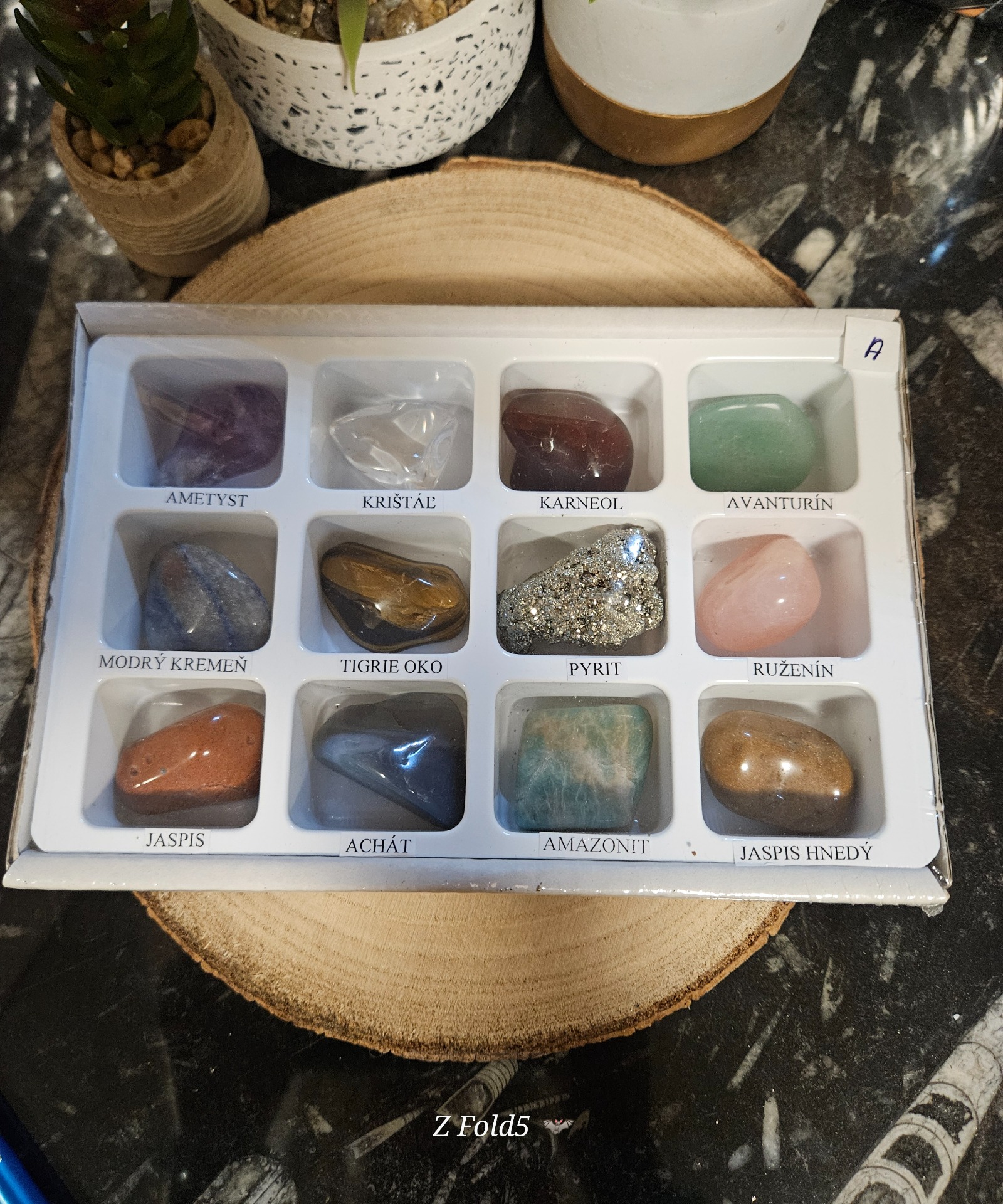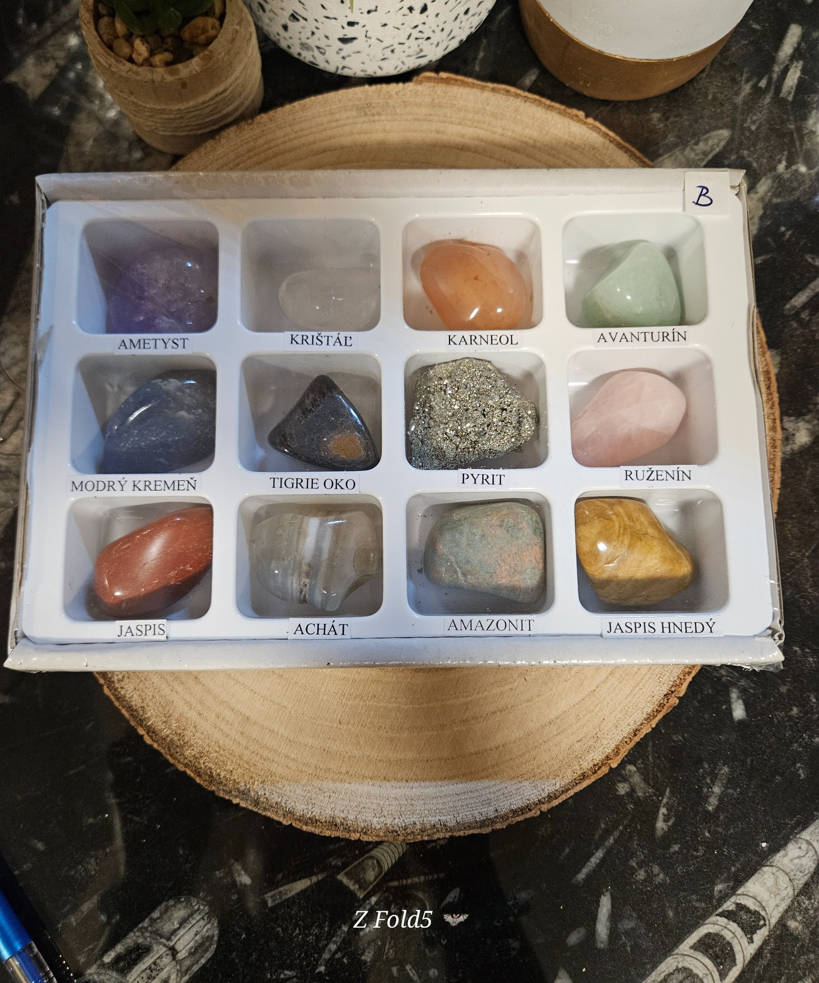 Box – krabička vyrobená z trojvrstvovej lepenky veľkosti 19 x 12 x 3 cm obsahuje 12 kusov tromlovaných minerálov, ktoré sú uložené v plastovej forme. Pod každým kamienkom sa nachádza názov daného minerálu. Celý box je zabalený v priesvitnej fólii, ktorá chráni pred poškodením.