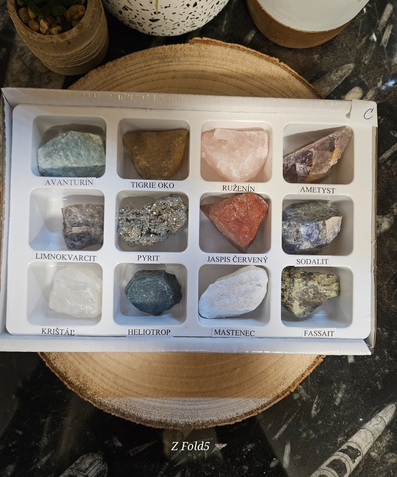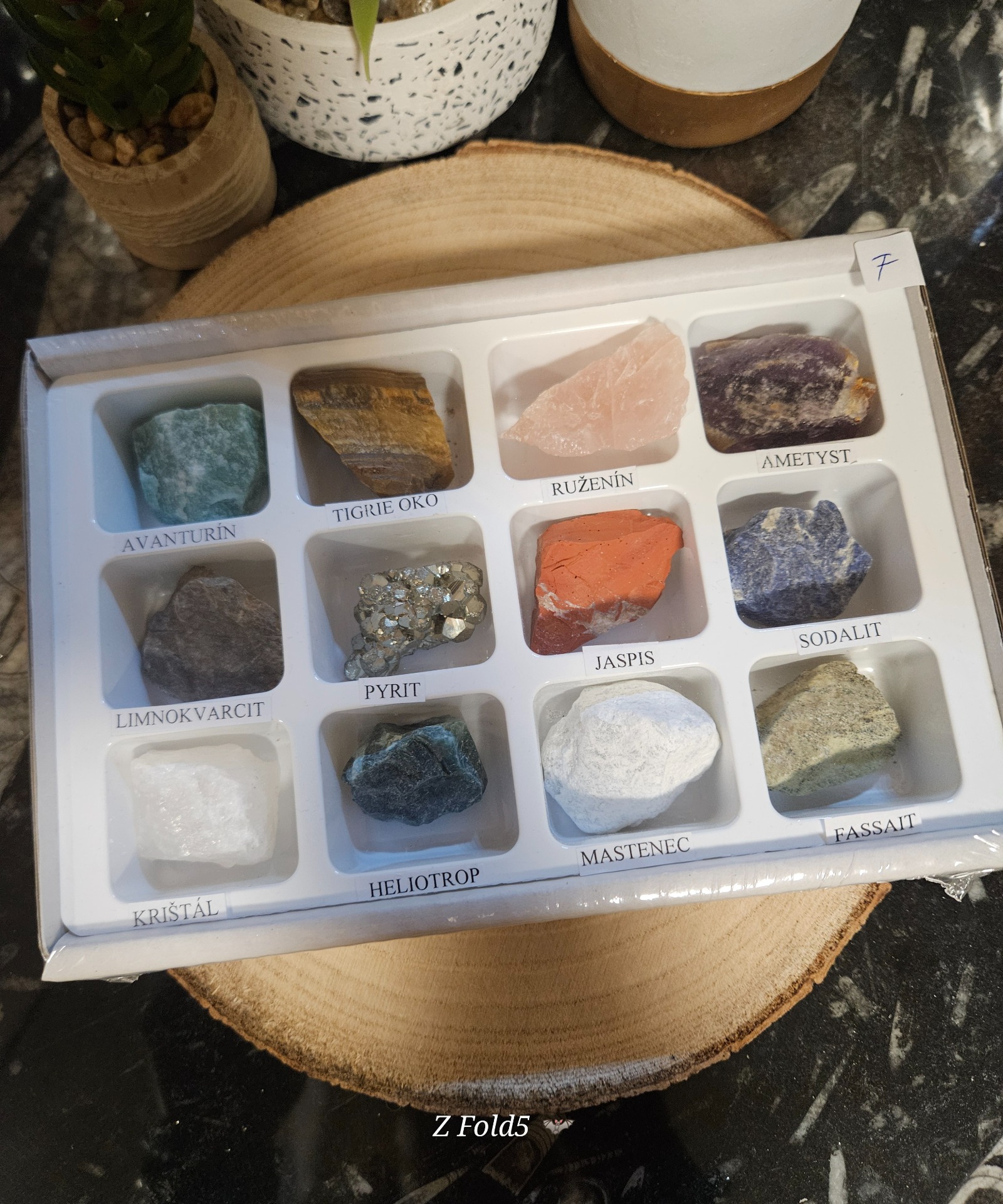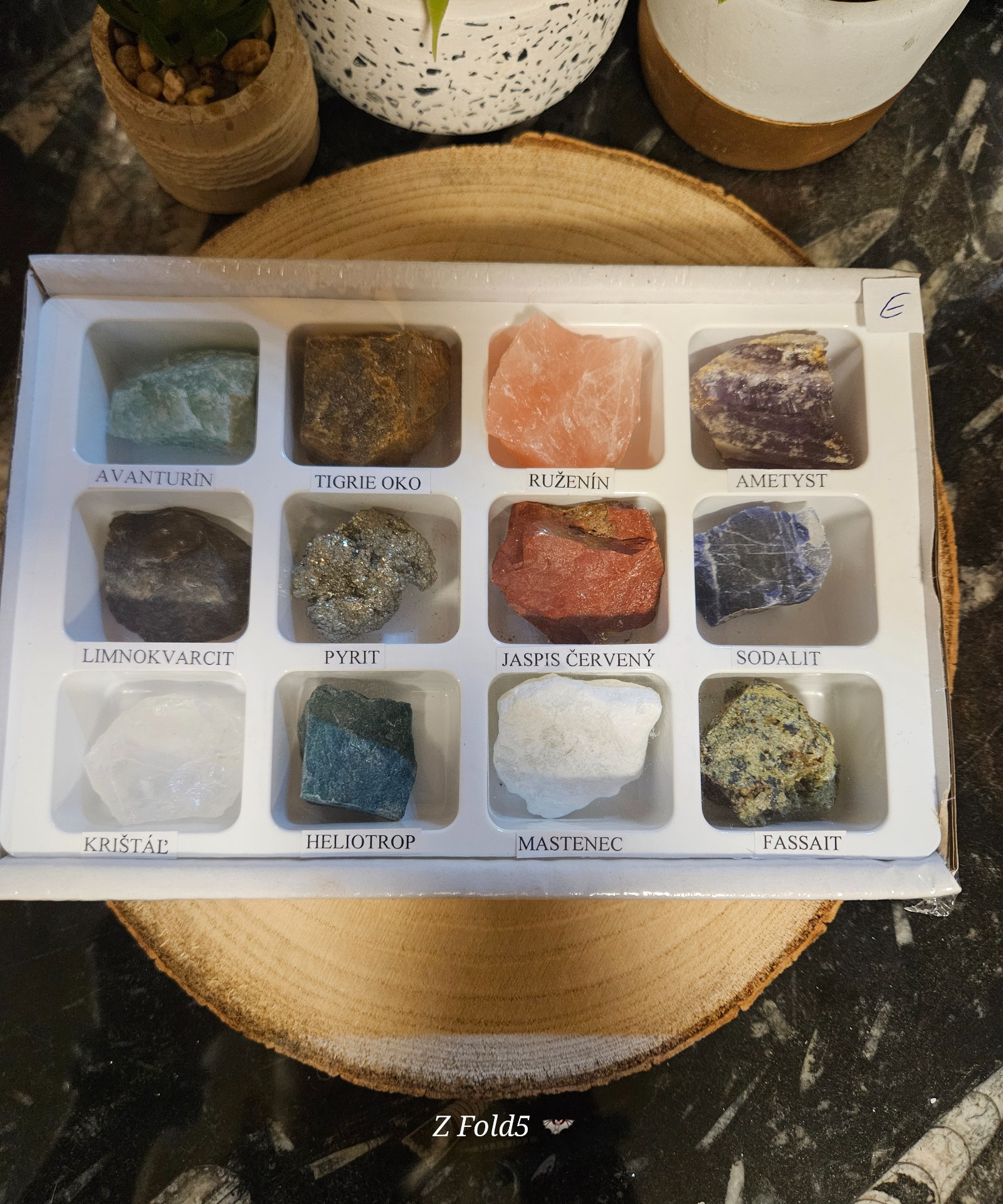 Box – krabička vyrobená z trojvrstvovej lepenky veľkosti 19 x 12 x 3 cm obsahuje 12 kusov tromlovaných minerálov, ktoré sú uložené v plastovej forme. Pod každým kamienkom sa nachádza názov daného minerálu. Celý box je zabalený v priesvitnej fólii, ktorá chráni pred poškodením.