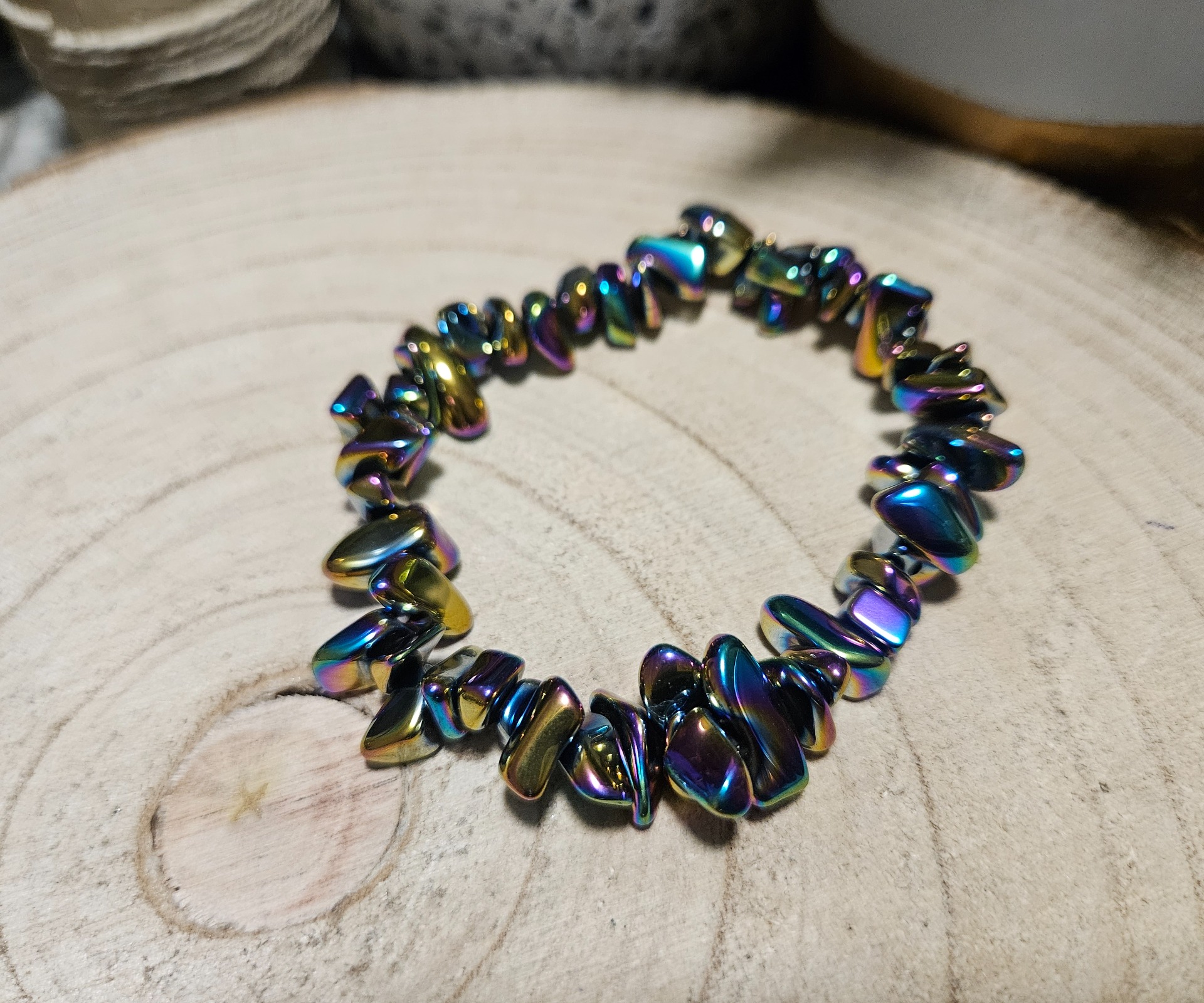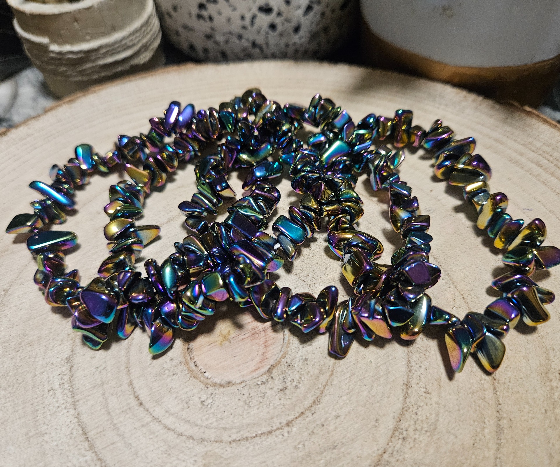 Tento Hematitový Chip Náramok kombinuje klasickú silu ochranného minerálu s ohromujúcim, moderným vyhotovením. Náramok je zložený z malých, nepravidelne tvarovaných kúskov Hematitu (chipov), ktoré boli ošetrené špeciálnym povlakom Aura Aqua. Výsledkom je žiarivý, dúhovo sfarbený kovový lesk, ktorý sa mení s každým dopadom svetla.