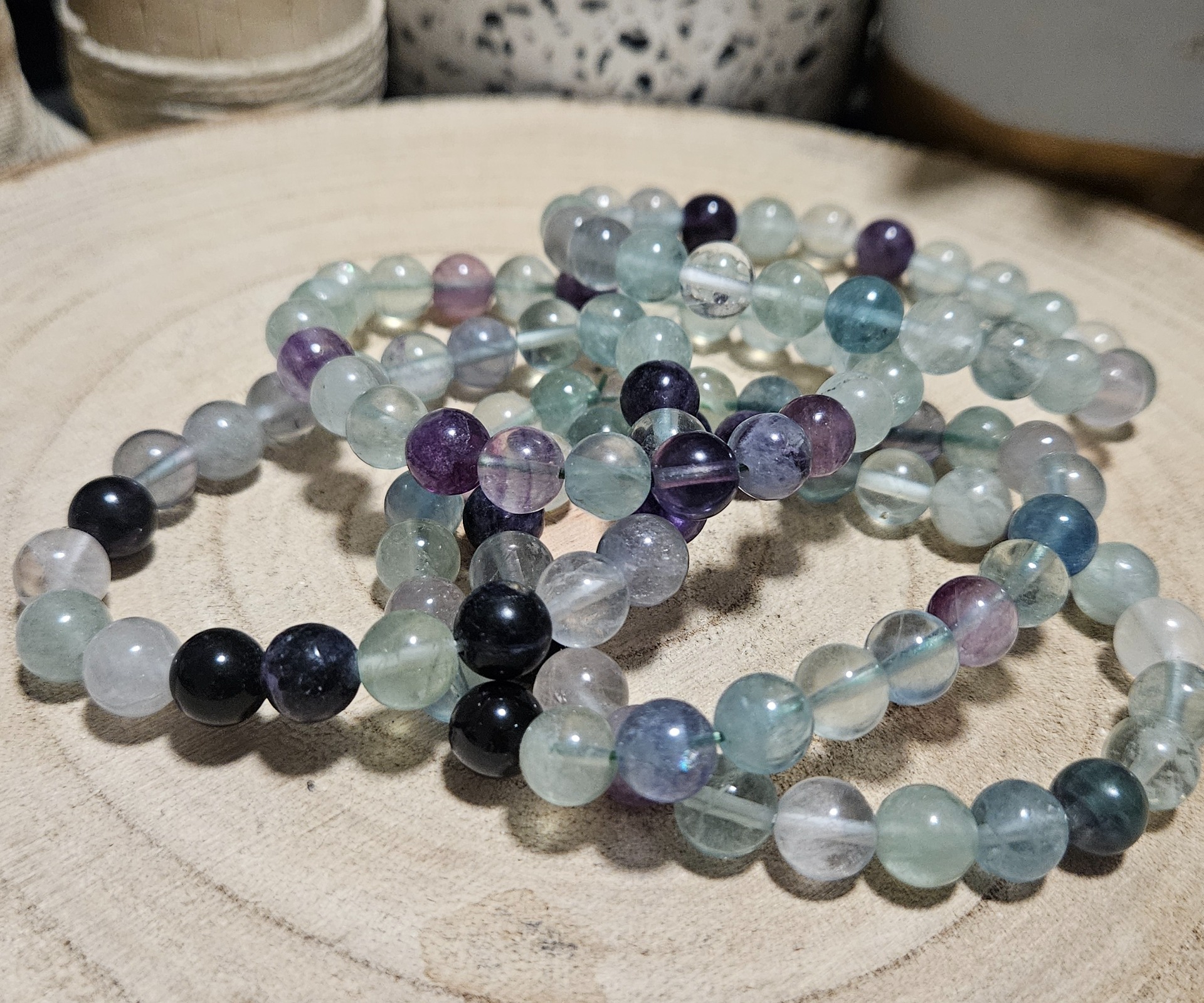 ​Tento klasický, elegantný 8 mm korálkový náramok v sebe nesie všetky farby a čistiacu silu Fluoritu. Dokonale leštený povrch korálok zvýrazňuje charakteristickú, vrstvenú textúru kameňa (fialové, zelené, modrasté a číre odtiene). Navlečený na pružnom elastickom lanku zaisťuje pohodlné a stabilné nosenie. Keďže je Fluorit prírodný kameň, vzory a farebné pomery sú jedinečné, a preto bude vaša objednávka odoslaná na základe náhodného výberu.