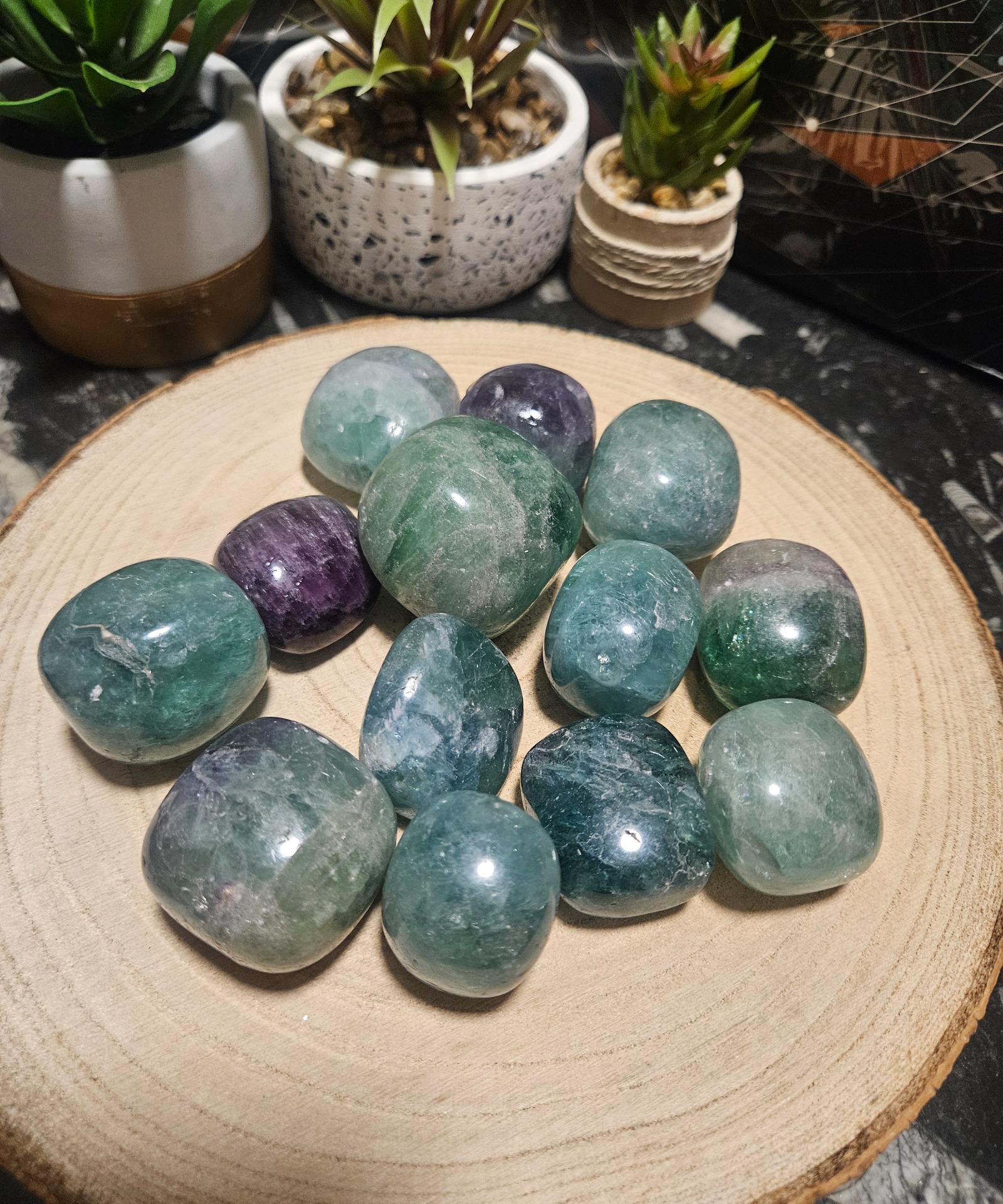 Tento veľký Fluoritový Hladený Kameň predvádza krásne, vrstvené farby Fluoritu (odtiene fialovej, zelenej, modrej a čírej) v hladkej, leštenej forme. Jeho veľkosť 3–5 cm je ideálna na nosenie v taške alebo vo vrecku, alebo na držanie v dlani počas meditácie. Keďže má každý kus jedinečný vzor a farebné zloženie, vaša objednávka bude odoslaná na základe náhodného výberu.