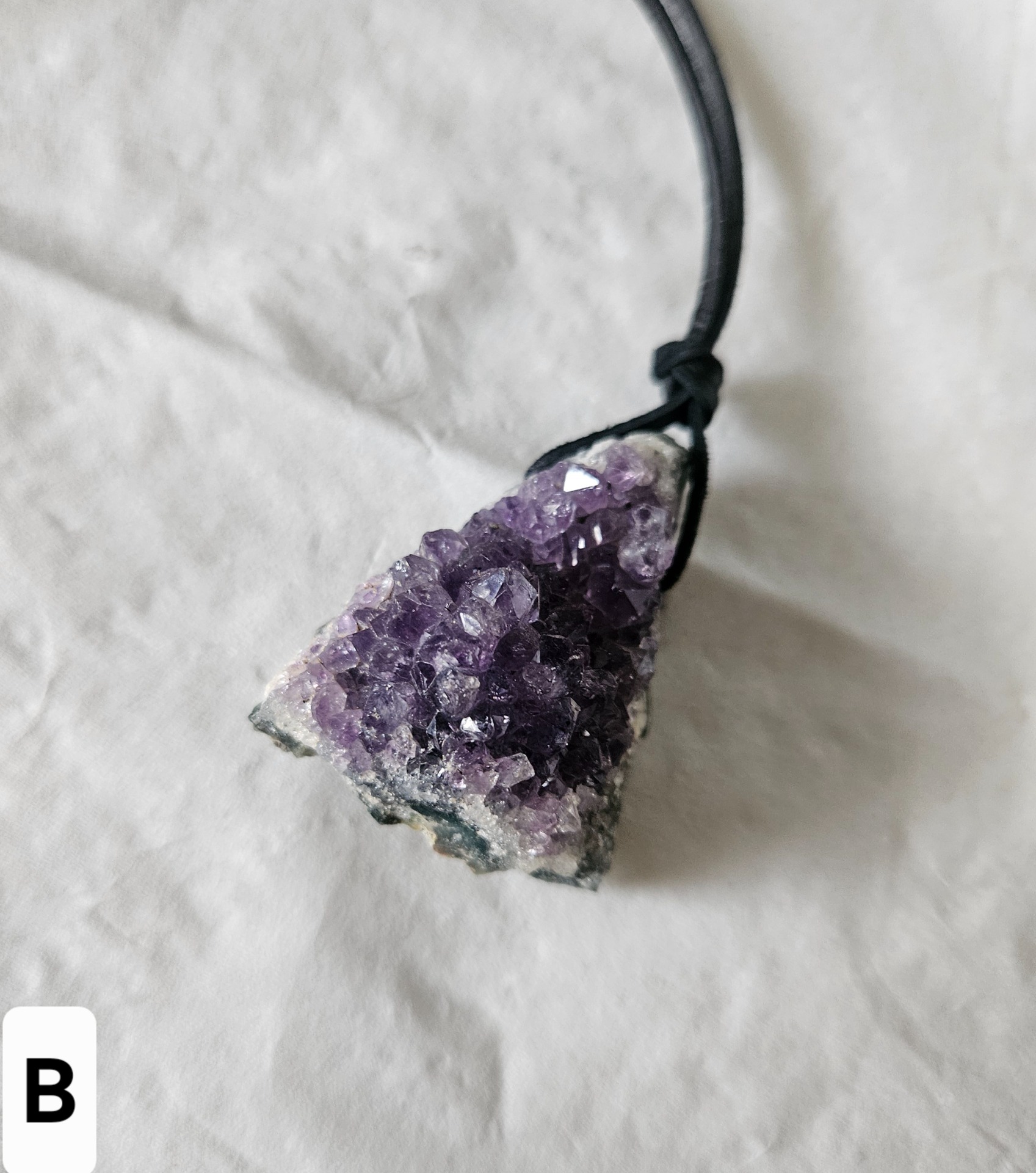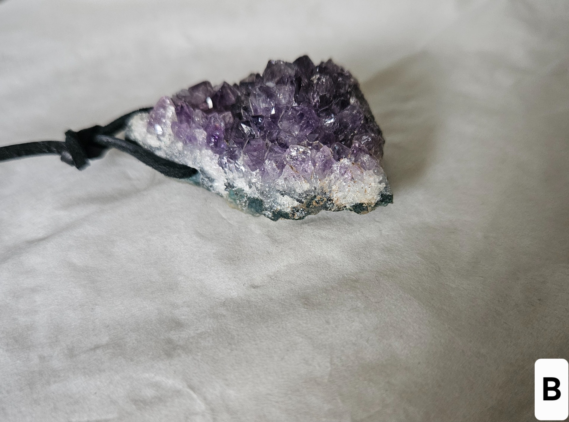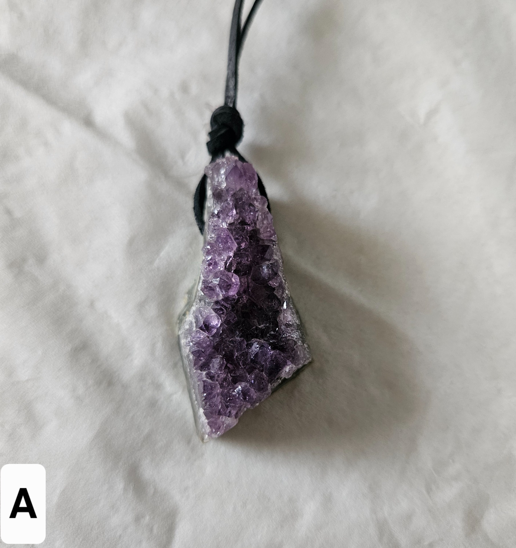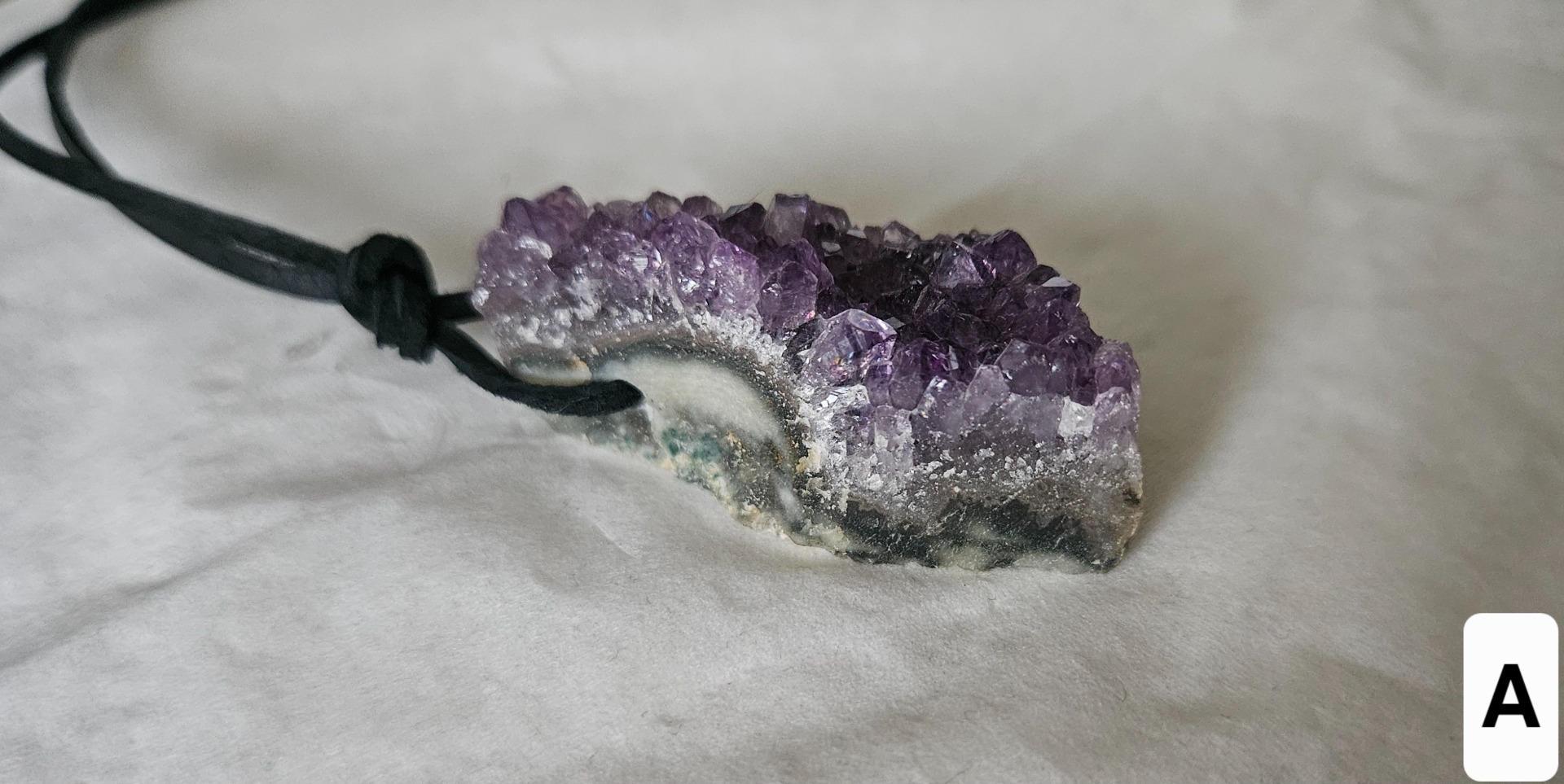 Vŕtaný Ametystová drúza. Prívesok z prírodného ametystu – drúzy, prírodne vykryštalizovaný. Veľkosť – dĺžka cca 3 – 4 cm, hrúbka drúzy je cca 0,7- 1 cm.