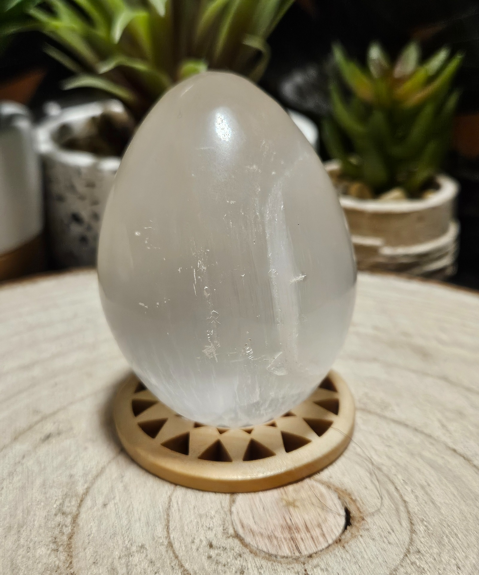 Selenit podporuje životné zmeny, prečisťuje rozum, upokojuje neistotu a starosti, dodáva pokoj, posilňuje schopnosti svojho nositeľa, reguluje preťaženie a nadmerné sebavedomie, podporuje vnútorný vývoj, láskavosť a intuíciu. Otvára vnútorné bohatstvo osobných pocitov, snivú stránku podstaty osobnosti a zbavuje strachu. Jedná sa o jeden z nasilnejších kryštálov, ktorý dodáva telu energiu a je výborný pre duchovnú prácu. Podporuje telepatiu. Vajce symbolizuje nové zrodenie a neustálu obmenu. Guľa zo selenitu vytvorí pokojnú a mierumilovnú atmosféru. Selenit nesie v sebe informáciu, čo sa kedy na svete udialo. Dokáže dosiahnuť aj do minulých životov. Prináša porozumenie dejom, ktoré sa odohrávajú v podvedomí. Dokáže rozptýliť a stabilizovať nevyspytateľné pocity. Najvýznamnejšie liečivé schopnosti Selenitu sa prejavujú na energetickej úrovni.