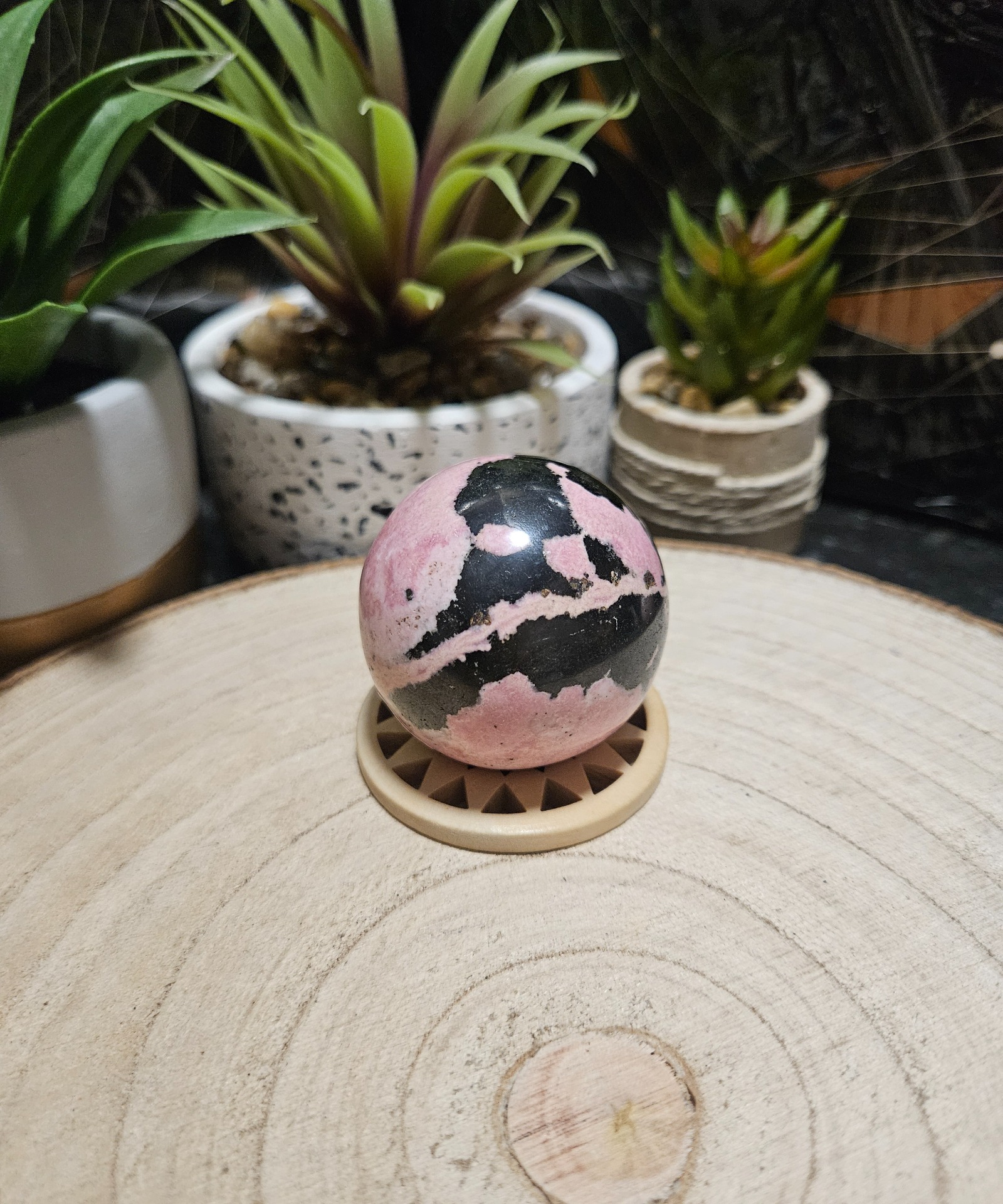 Táto Rodochrozitová guľa ukrýva pre teba 185 gramov čistej, bezpodmienečnej lásky. Jej jedinečnosť spočíva v striedaní živej ružovej a dramatickej čiernej kresby, čo robí každý kúsok umeleckým dielom. Táto guľa ti pomôže, ak sa chceš zmieriť so svojou minulosťou a začať sa skutočne milovať! Používaj ju ako meditačný fokus alebo ju umiestni do izby, aby energia lásky rovnomerne prúdila priestorom.