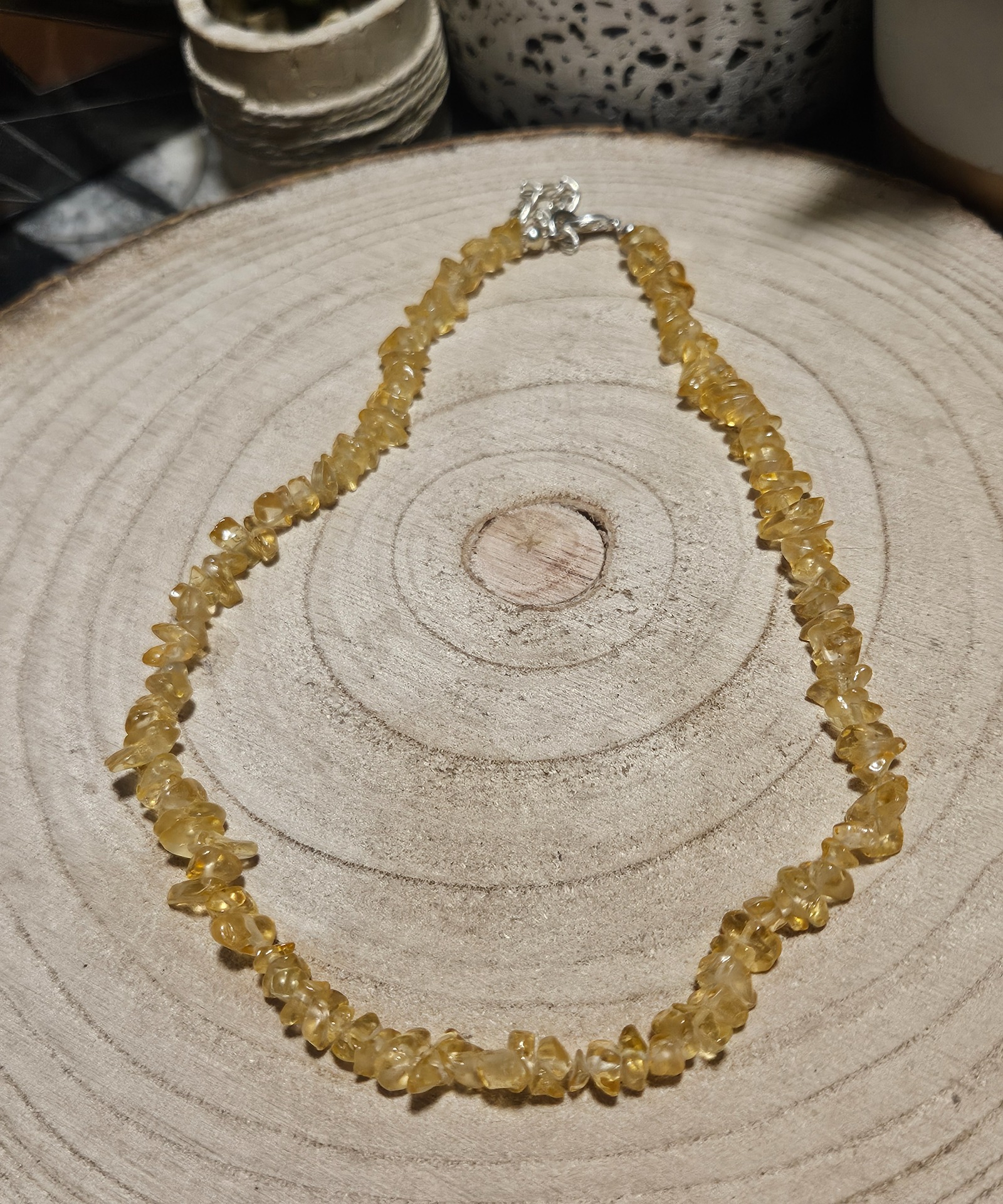 Tento Náhrdelník z Citrínových Štiepok nie je len nápadný šperk, ale nepretržitý zdroj, ktorý vás zásobuje optimismom. Malé, surové, nepravidelné kúsky (štiepky) Citrínu sú spojené do retiazky dlhej 40–45 cm, aby vyžarovali svoju teplú, životodarnú energiu blízko vášho srdca a Krčnej Čakry.